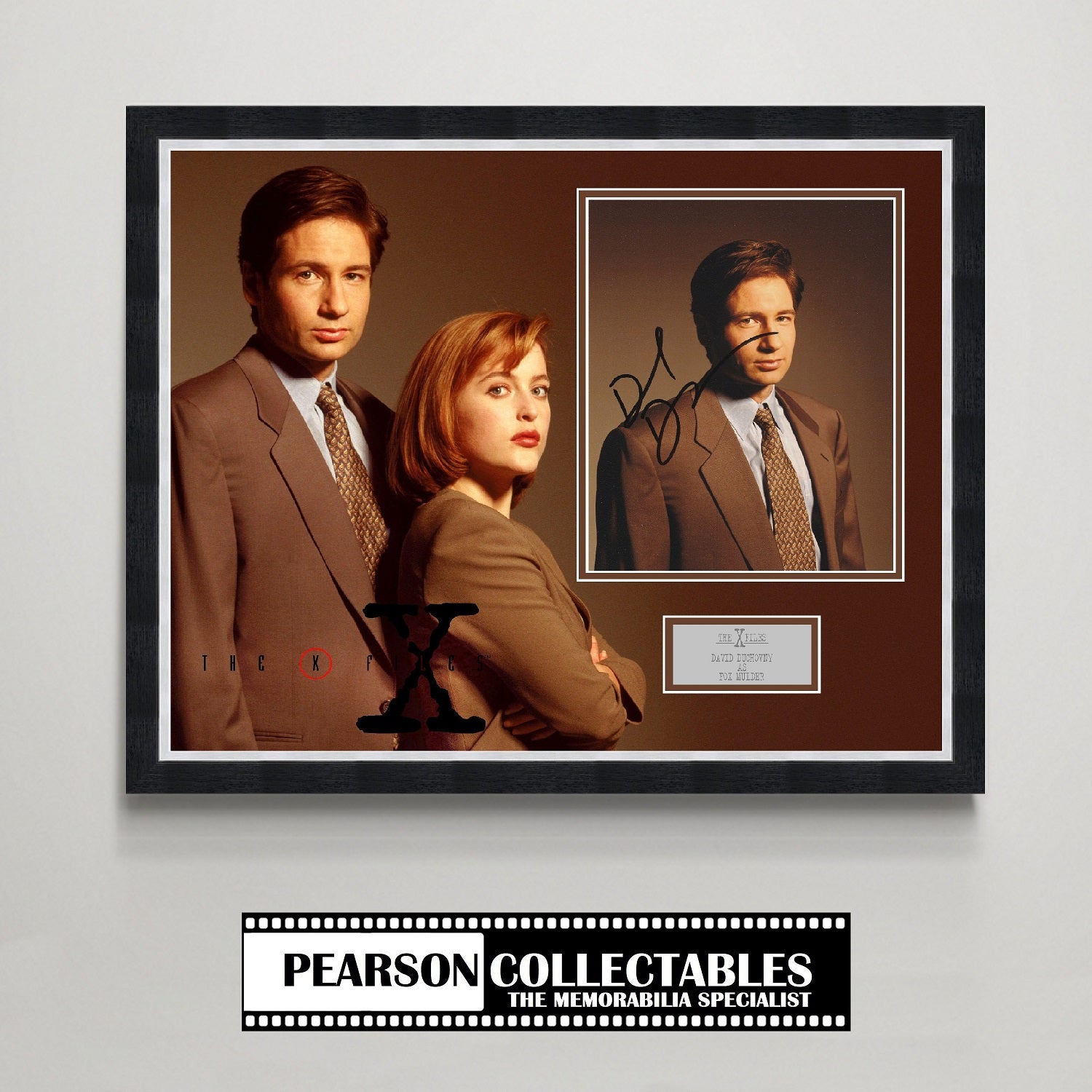 This handmade autograph display contains an 8x10'' photo of the character Fox Mulder, hand-signed by actor David Duchovny. Presented in a photo-mount display with coloured inlay, it comes complete with an engraved character plaque and is custom framed in a brushed black and chrome frame.